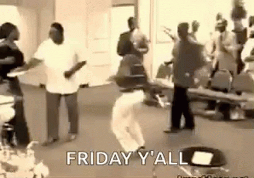 People enthusiastically dancing and celebrating Friday, with one person falling and quickly recovering.