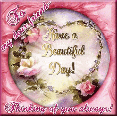A beautiful greeting card with a floral heart wreath, wishing a dear friend a beautiful day.