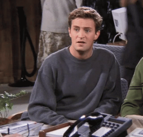 Chandler Bing (Matthew Perry) from Friends, exasperatedly declares "I want to quit the bank!" while sitting at a desk.