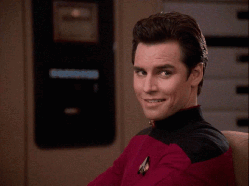 A character from Friends Of Desoto, possibly Lavelle, smiling in a Star Trek uniform.