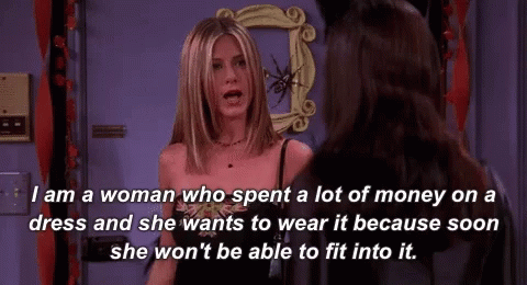 Rachel Green from Friends explains her urgency to wear an expensive dress before she can no longer fit into it.