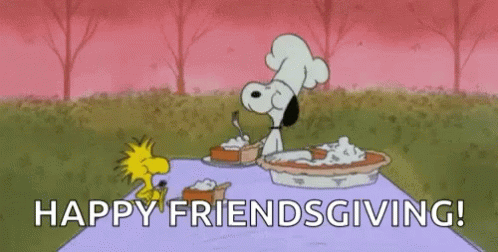 Snoopy and Woodstock celebrate Friendsgiving with pie at a picnic table.