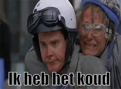 Lloyd Christmas and Harry Dunne from Dumb and Dumber on a scooter, with Harry saying 'Ik heb het koud' (I am cold).