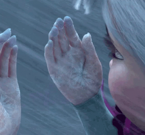Close-up of hands covered in ice, showing intricate frost patterns on the skin.