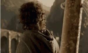 Frodo Baggins from Lord of the Rings turns and offers a gentle smile to the camera.