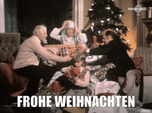The Hoppenstedts family joyfully opens Christmas gifts, a classic scene from Loriot's Frohe Weihnachten sketch.
