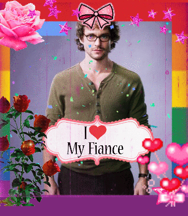 A fan edit featuring a man with an 'I ❤️ My Fiance' sign, surrounded by colorful hearts, stars, and roses, in the 'Frolic Fiances' style.