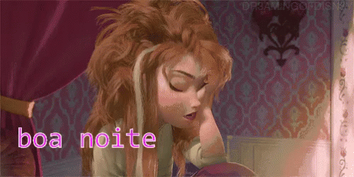 Anna from Disney's Frozen looking sleepy with messy hair, accompanied by the Portuguese text 'boa noite' (good night).