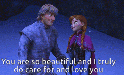 Kristoff and Anna from Frozen share a tender moment in the snow, expressing love and care.