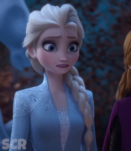 Elsa from Frozen 2 shows a worried expression, wearing her iconic light blue dress and braid.