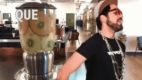 A man enthusiastically promotes fresh fruit water from a dispenser at WeWork Mexico.