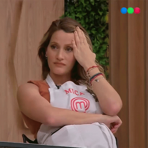 Mica Viciconte looks frustrated during Masterchef Argentina, holding her hand to her forehead in a moment of stress.