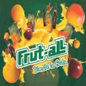 A vibrant advertisement for Frut-ALL juice, featuring various fruits and a mango nectar juice box. Includes Maria Durbani.