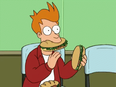 Futurama's Fry enthusiastically clapping while enjoying a sandwich.