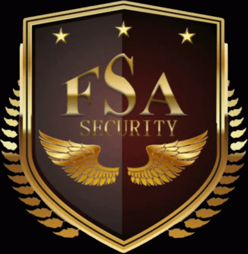 Animated logo for FSA Security, featuring a golden shield, wings, and falling confetti.