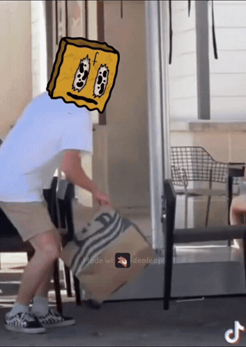 A Fudbuds Fudbuddies member pranks a woman at an outdoor cafe by placing a paper bag over her head.