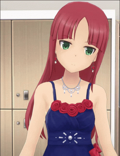 Fujino Yayoi from Alice Gear Aegis, with red hair and green eyes, wearing a blue dress with red roses.