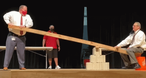 Two men demonstrate the principle of a fulcrum lever using a wooden plank and cinder blocks on a stage.