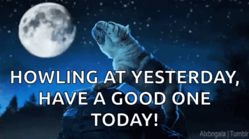 A cute dog howls at a full moon with the message 'Howling at yesterday, have a good one today!'