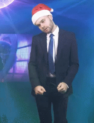 gfdarwin dances in a suit and Santa hat, performing a fun routine on stage.