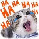 A cat with its mouth wide open, appearing to laugh, with 'HA HA HA HA HA' text superimposed on screen.