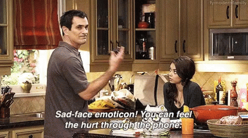 Ty Burrell as Phil Dunphy says 'Sad-face emoticon! You can feel the hurt through the phone' in a kitchen scene.