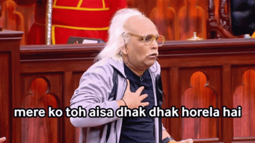 Man reacting with 'Mere Ko Toh Aaisa Dhak Dhak Horela Hai' meme, expressing nervousness in a courtroom.