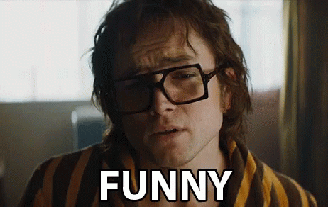 Taron Egerton as Elton John in Rocketman, wearing glasses and a striped robe, with 'FUNNY' superimposed.