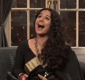 Indian actress Vidya Balan laughing loudly and happily while sitting on a couch, a truly funny moment.