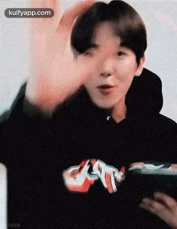 A young man in a black hoodie waves his hand while holding a tablet, looking directly at the camera.