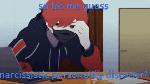 Futa Kajiyama from Milgram, wearing a mask, ponders 'narcissistic personality disorder' while at a laptop.