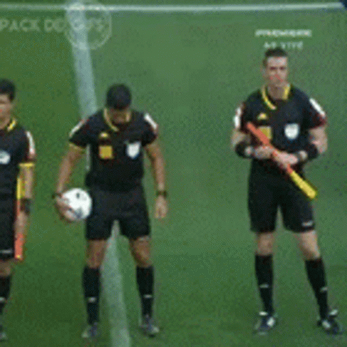 Brazilian soccer referees on the field as a large advertising board unexpectedly falls, hitting two of them during a match.