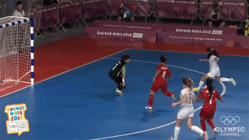 Female futsal players compete, scoring a goal during the Buenos Aires 2018 Youth Olympic Games.