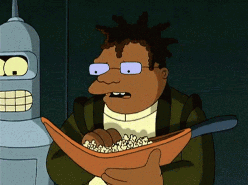 Hermes Conrad from Futurama eats popcorn from a large bowl while Bender watches in the background.