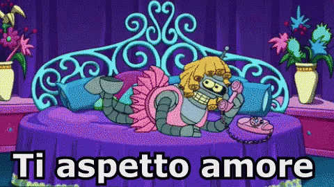 Bender from Futurama lies sadly in bed, talking on the phone and waiting for love.