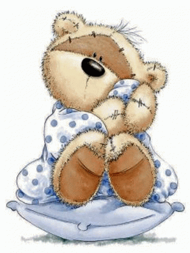 A cute Fuzzy Moon bear snuggles with its blankie, ready for a good night's sleep.