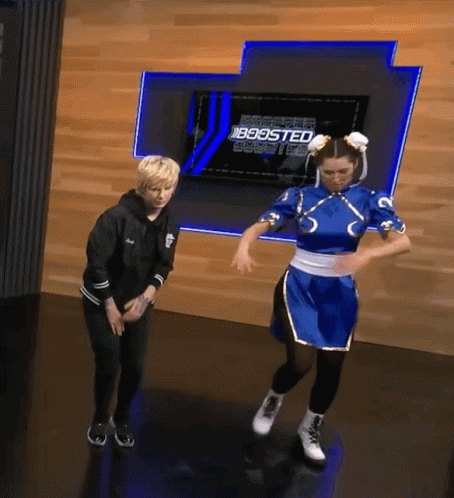 Frosk as Chun Li dances alongside Ovilee May and Goldenboy on G4tv Boosted.
