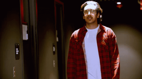 Kassem G in a plaid shirt and glasses stands in a dark hallway.