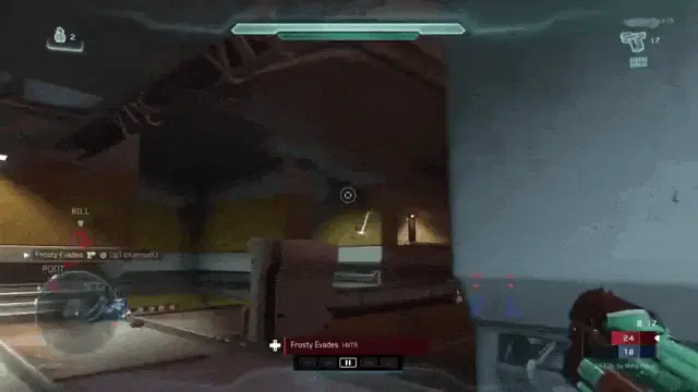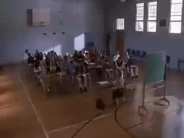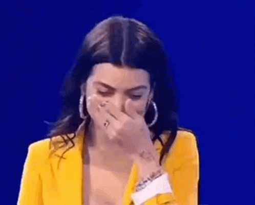 Gabi Prado laughing, covering her face while wearing a yellow jacket against a blue background.