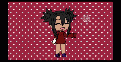 Happy Gacha Life character in a red sweater, smiling against a heart-patterned background.