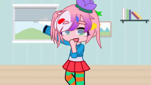 A Gacha Life character with pink hair, a purple hat, and swirly eyes stands in a room.