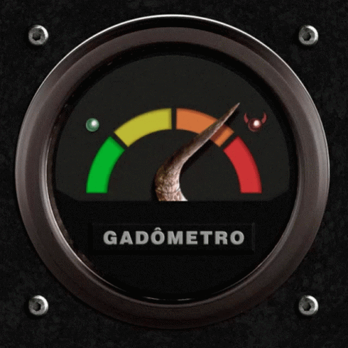 Animated gauge displaying 'Gadômetro' with a needle in the red zone, indicating a high level of 'gado'.