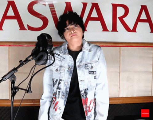 Mita The Virgin expresses 'I don't know' with a shrug, standing in front of a microphone and an ASWARA sign.