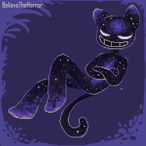 A mesmerizing pixel art depiction of a galaxy cat, embodying a weirdcore aesthetic with 'BelieveTheHorror' text.