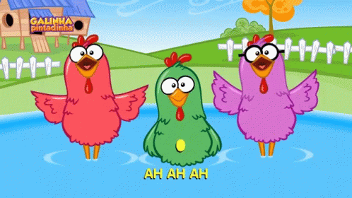 Galinha Pintadinha cartoon chickens, including a green chick, dive into water.