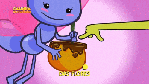 Galinha Pintadinha's butterfly character enjoys honey from a pot, sharing a sweet moment.