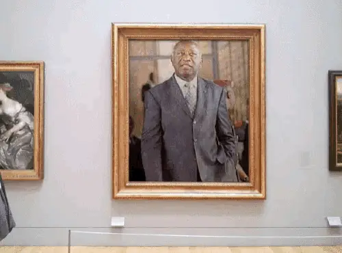 A man stands in an art gallery, observing various paintings displayed on the wall.