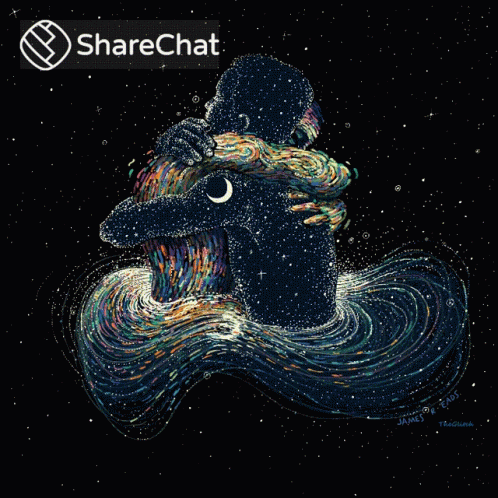 Two cosmic figures made of stars and galaxies embrace in a vibrant, animated illustration, with the ShareChat logo visible.