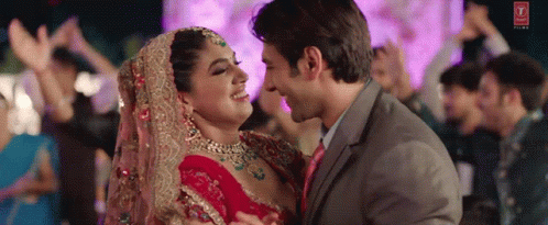 Kartik Aaryan and the bride share a loving hug at their wedding, surrounded by guests in a festive Bollywood scene.