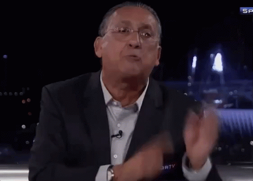 Galvão Bueno, wearing glasses and a suit, speaks and gestures in front of a screen with the SPORTV logo.